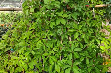A very long woody stem that grows up to 30 m long, and has branched tendrils on the shoots. Young shoots are dark brown and covered with lanticels. The buds are small and reddish, and the leaves are 1-20 cm wide with 3 lobes and serrated edges. The leaves are dark green in color, and in autumn they take on red or yellow shades. They bloom from June to July. Flowers are greenish and small. The fruit is a blue berry with a diameter of about 10 mm, which contains 1 to 2 seeds. Deep and moist soil suits it.